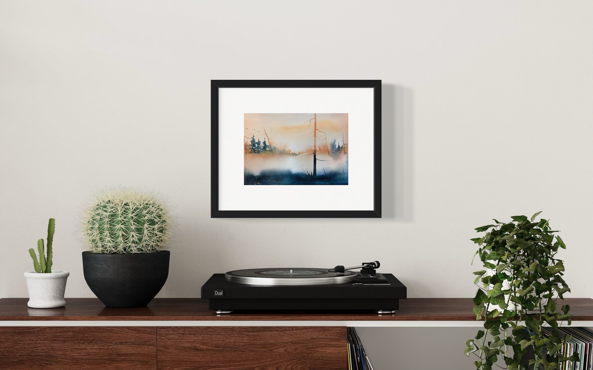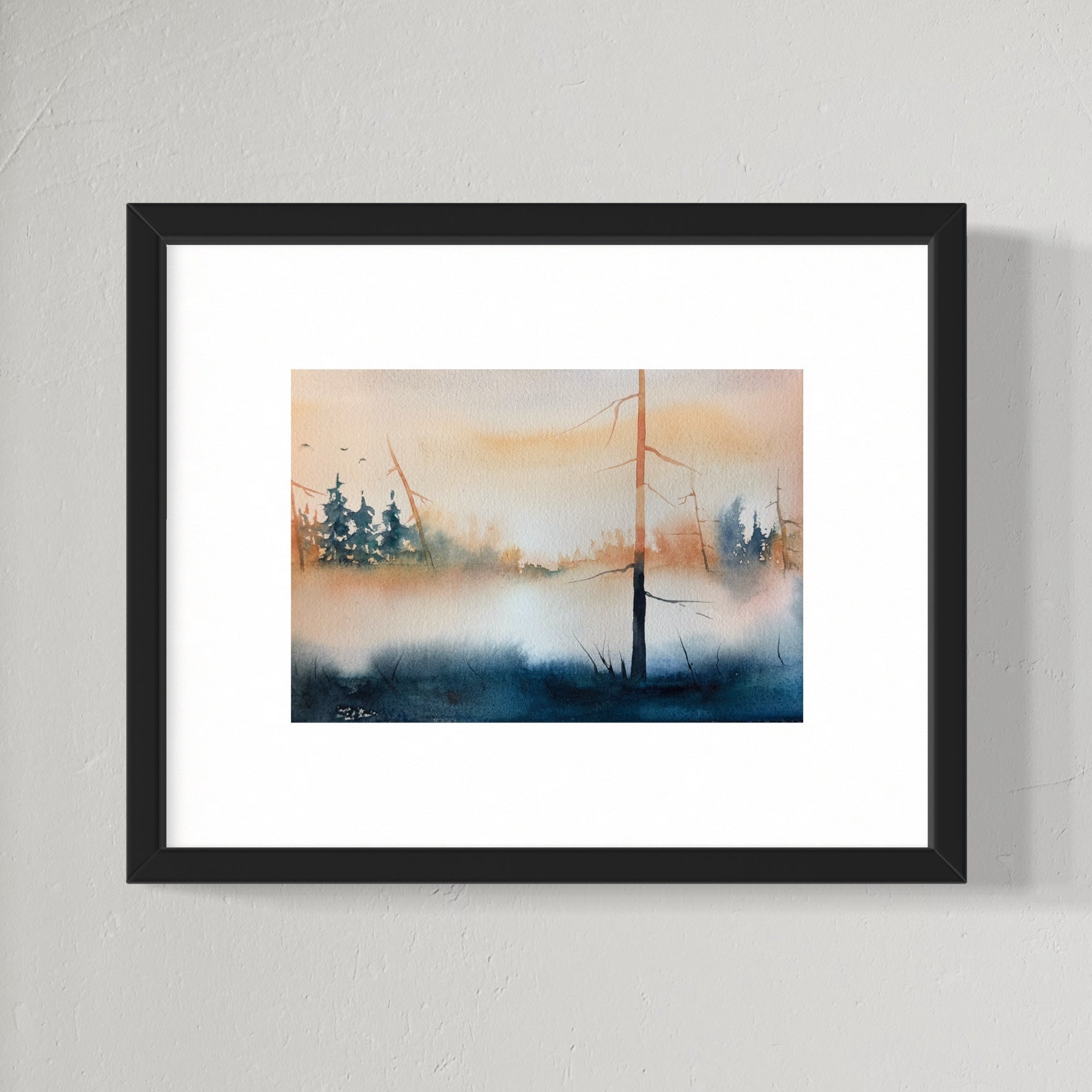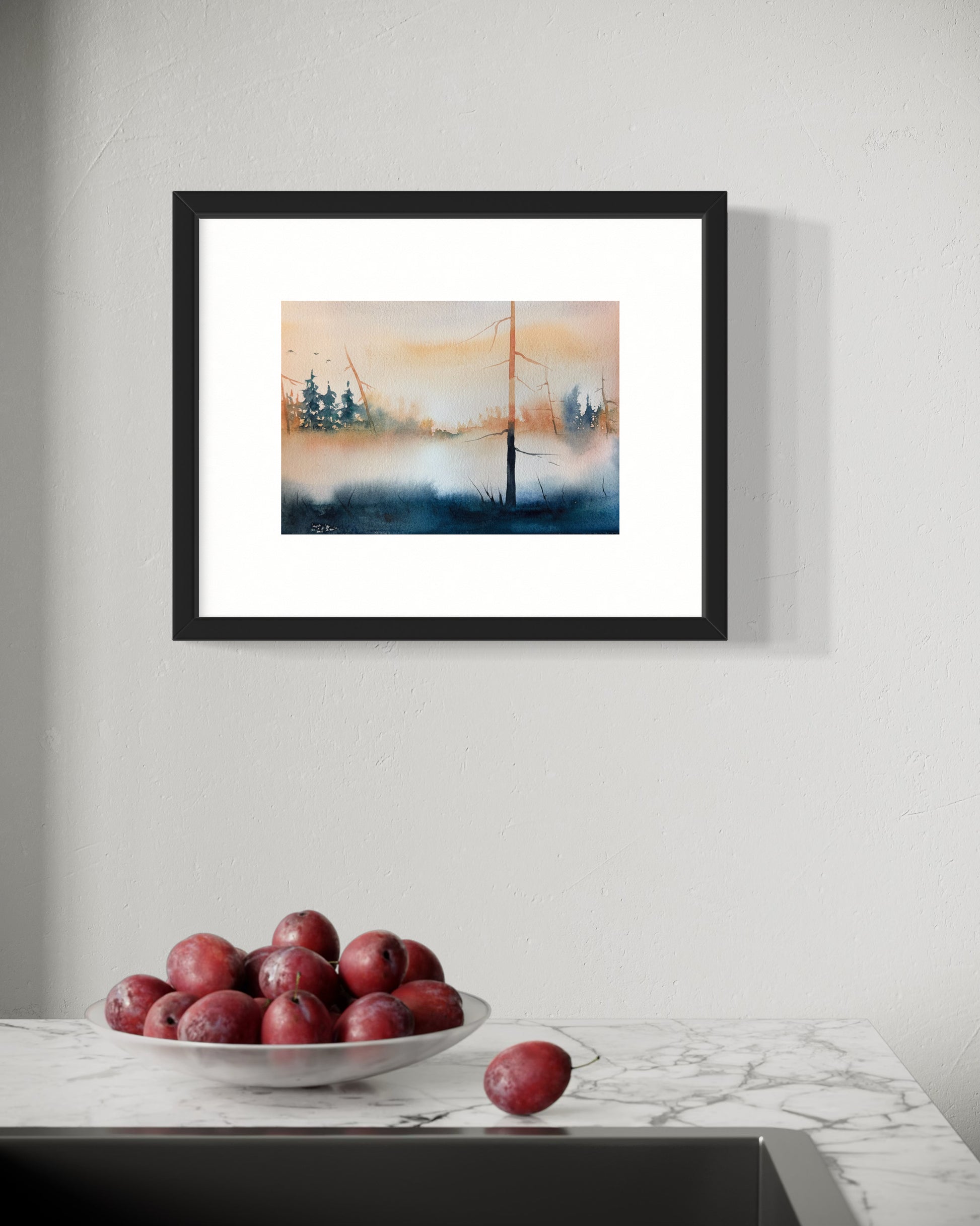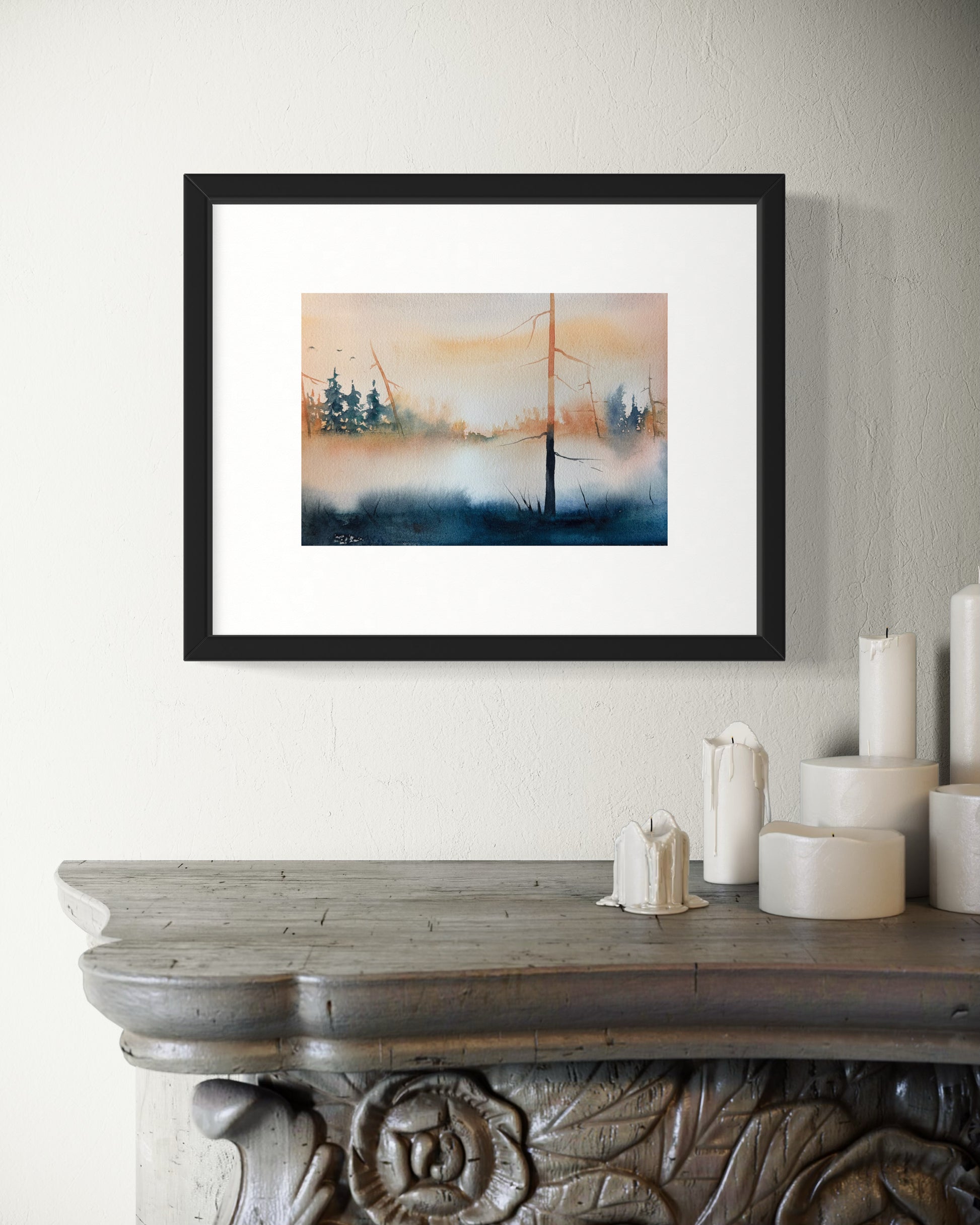 A quiet forest stands in the fog, where warm light meets cool shadows. Painted in 2025 with professional watercolors on Arches 100% cotton paper. The painting measures 7 x 10 in (17 x 23 cm).